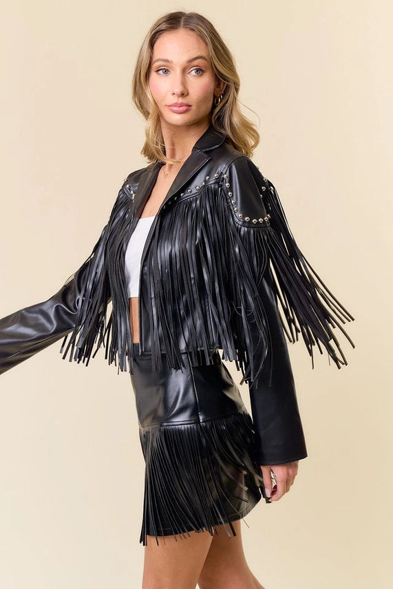 Description needs writing. Manufacturer's details: Black pu silver studded fringe down jacket(faux leather) - Relaxed fit - Studded fringe Model is 5'8 and is wearing a size small