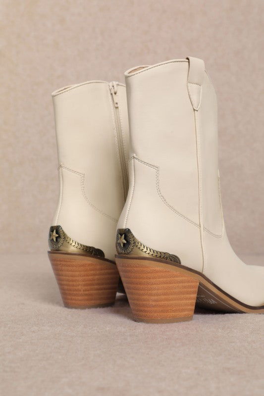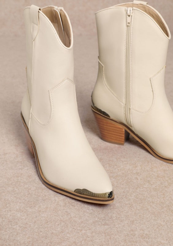 Description needs writing. Manufacturer's details: Saddle up in style with the Beverly Ivory Western Bootie - where classic cowboy charm meets modern chic. Crafted in smooth ivory vegan leather with a pointed toe, stacked wooden heel, and antique metal toe and heel caps, this boot is the perfect blend of timeless and trendy. From music festivals to city streets, Beverly brings a bold yet versatile edge to every outfit.