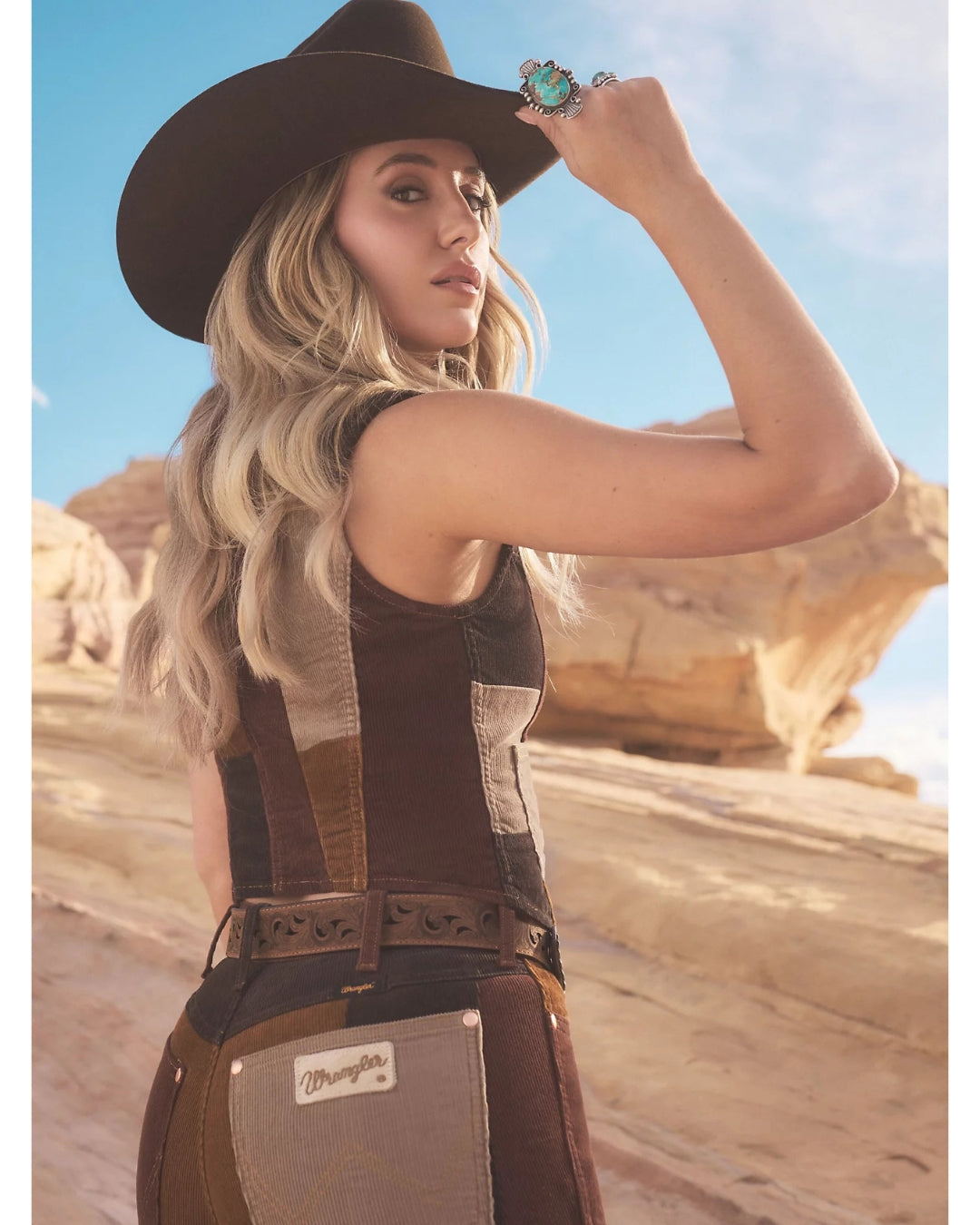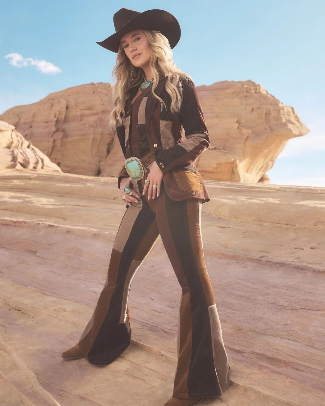 Saddle up cowgirl, ‘cause these Wrangler® x Lainey Wilson Patchwork Bell Bottoms aren't just pants, they’re a whole performance and quite frankly, a showstopper. Cut from soft corduroy and stitched together in warm autumn tones, they’re a patchwork dedication to those chasing the bold and free. The high-rise waist cinches just right while the flare offers stunning balance, and lets you strut like a headline. These bell-bottoms are wide enough to hold your secrets, your setlist, and maybe even last night’s good luck charm.